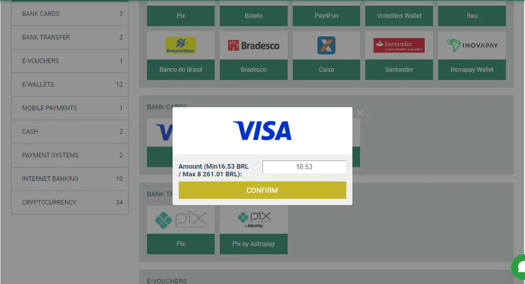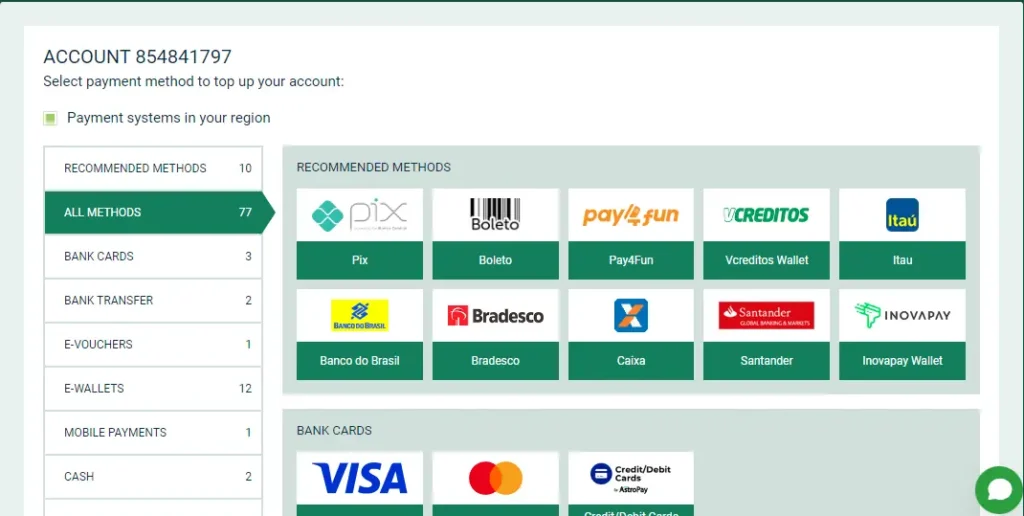 La liste des méthodes de paiement disponibles s’adapte automatiquement à votre localisation géographique. Vous y trouverez des options populaires comme les cartes bancaires, virements bancaires, portefeuilles électroniques, systèmes de paiement (comme Perfect Money ou Payeer), ainsi que diverses cryptomonnaies, dont le Bitcoin, l’Ethereum ou l’USDT. Des recommandations spécifiques sont également proposées pour vous guider vers les solutions les plus simples et efficaces.