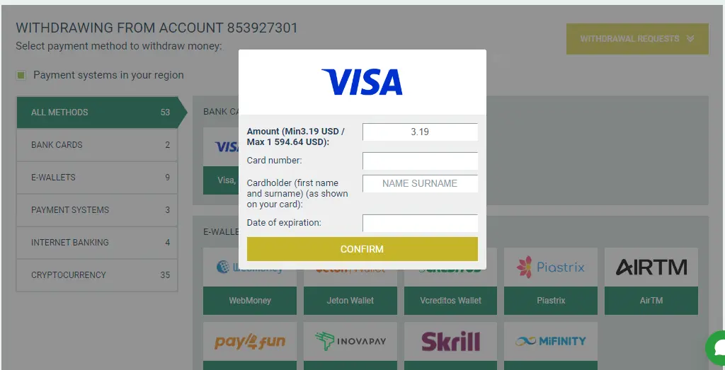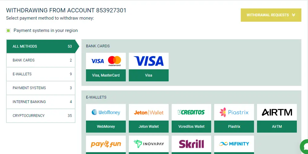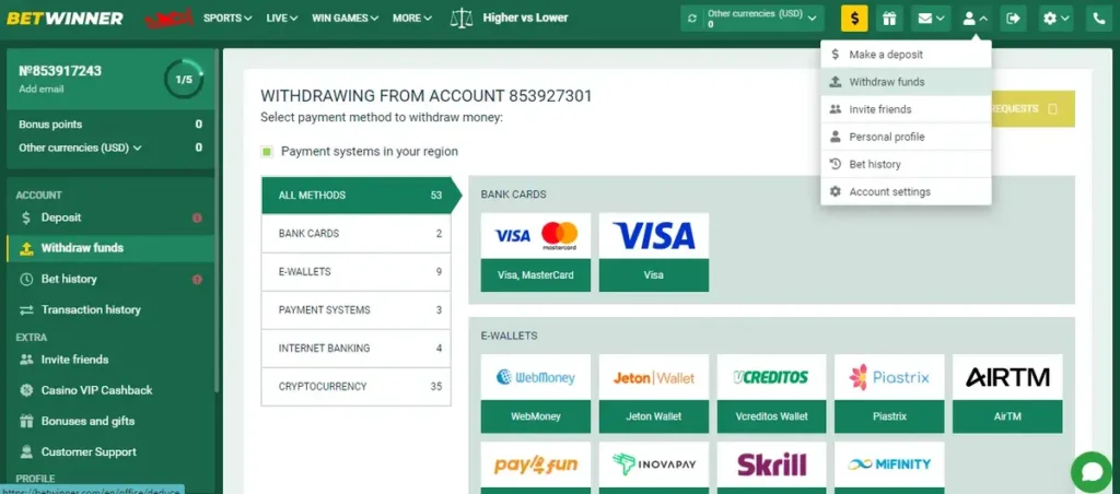 Depuis n’importe quelle page du site, cliquez sur le menu déroulant en haut de l’écran et sélectionnez «Retirer des fonds». Vous serez redirigé vers la section où toutes les méthodes de retrait disponibles pour votre région sont affichées.